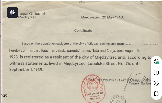 --Abram Roza [Mojzesz's father]. b. 1881, Luchow. Resided in Warsaw at ul. Bonifraterska 17/21.